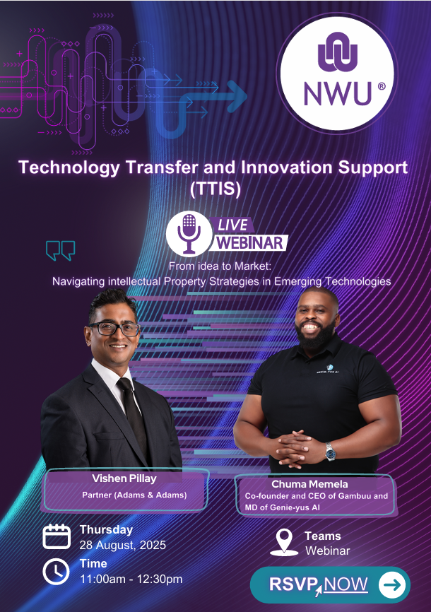 I had the opportunity to join the Technology Transfer and Innovation Support (TTIS) Webinar hosted by North-West University. Under the theme “From Idea to Market: Navigating Intellectual Property Strategies in Emerging Technologies,” I shared insights on innovation, entrepreneurship, and how to effectively align intellectual property with business growth. Alongside Vishen Pillay, Partner at Adams & Adams, we explored strategies for taking ideas to market, protecting innovation, and leveraging IP in the rapidly evolving technology landscape.