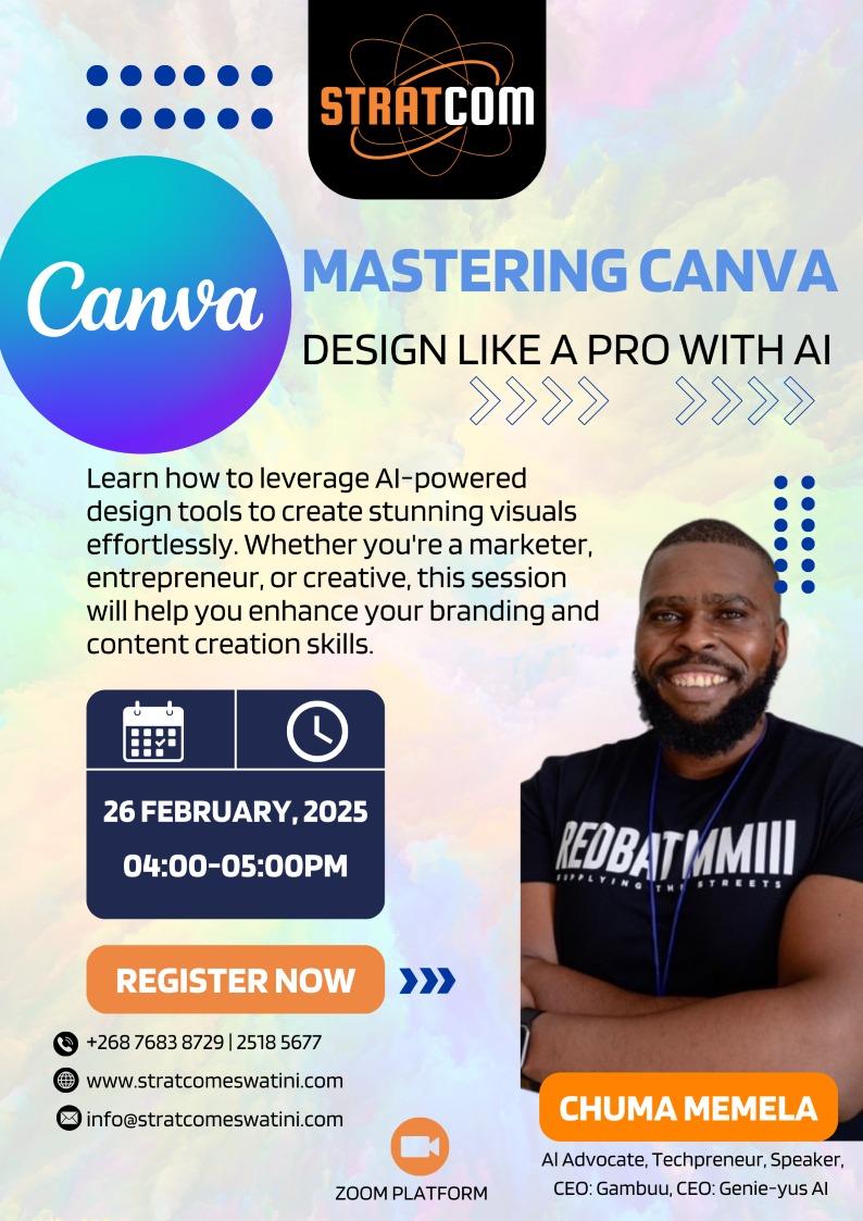 I facilitated a webinar titled “Mastering Canva: Design Like a Pro with AI” hosted by StratCom Eswatini. The session focused on teaching entrepreneurs, marketers, and creatives how to use AI-powered design tools to create professional and visually appealing content effortlessly. I demonstrated how Canva can be leveraged for branding, social media, and content creation, giving participants practical skills to enhance their digital presence without the need for outsourcing.